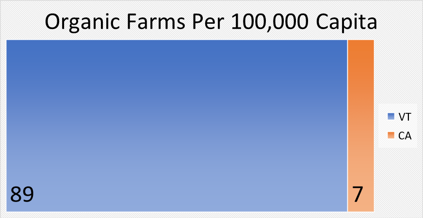 Vermont and Maine remained as the two top dogs in organic agriculture. Within these states there is an organic farm for approximately every 13 to 17 conventional farms. California popped back up on the list, which is impressive considering that it is ranked fifth in terms of the total number of farms in the country. Wisconsin is the only other state ranking in the top 10 for both the total number of farms in the state and the number of organic farms per conventional farm. The representation from the Midwest and Great Plains dropped from the list based on this new metric. Representation from U.S. southeast was low for both metrics.